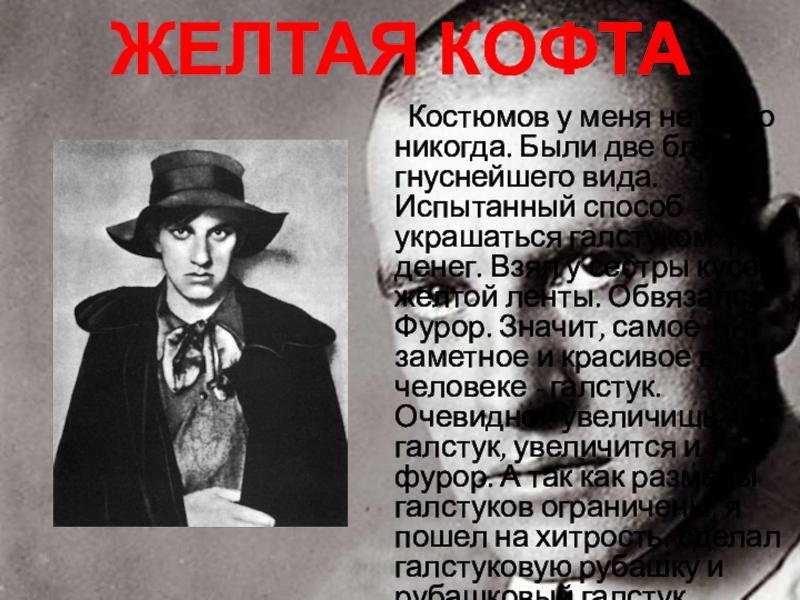 - гнуснейшего вида. Испытанный способ - украшаться галстуком. Нет денег. Взял у сестры кусок желтой ленты. Обвязался. Фурор. Значит, самое заметное и красивое в человеке - галстук. Очевидно - увеличишь галстук, увеличится и фурор. А так как размеры галстуков ограничены, я пошел на хитрость: сделал галстуковую рубашку и рубашковый галстук.