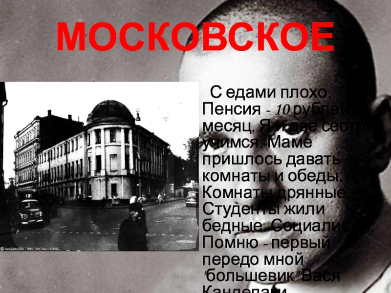 Я и две сестры учимся. Маме пришлось давать комнаты и обеды. Комнаты дрянные. Студенты жили бедные. Социалисты. Помню - первый передо мной "большевик" Вася Канделаки.