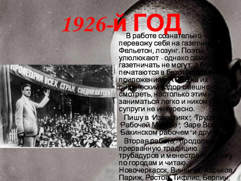 Вторая работа - продолжаю прерванную традицию трубадуров и менестрелей. Езжу по городам и читаю. Новочеркасск, Винница, Харьков, Париж, Ростов, Тифлис, Берлин, Казань, Свердловск, Тула, Прага, Ленинград, Москва, Воронеж, Ялта, Евпатория, Вятка, Уфа и т. д., и т. д., и т. д.