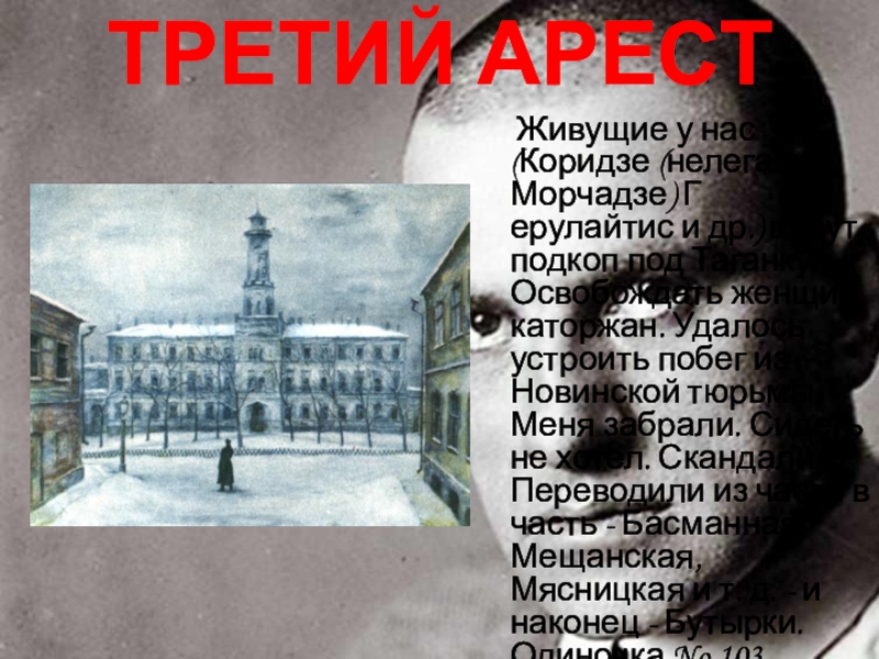 и др.) ведут подкоп под Таганку. Освобождать женщин каторжан. Удалось устроить побег из Новинской тюрьмы. Меня забрали. Сидеть не хотел. Скандалил. Переводили из части в часть - Басманная, Мещанская, Мясницкая и т. д. - и наконец - Бутырки. Одиночка No 103.