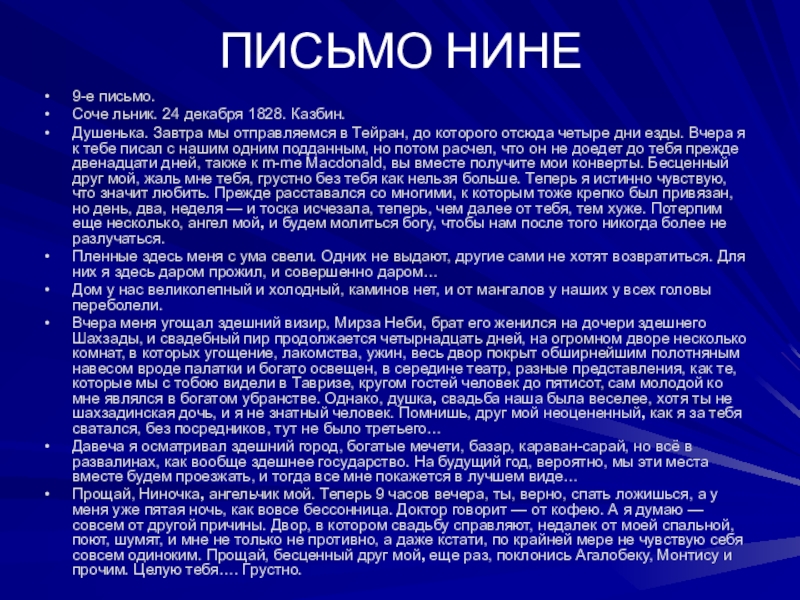 в Тейран, до которого отсюда четыре дни езды. Вчера я к тебе писал с нашим одним подданным, но потом расчел, что он не доедет до тебя прежде двенадцати дней, также к m-me Macdonald, вы вместе получите мои конверты. Бесценный друг мой, жаль мне тебя, грустно без тебя как нельзя больше. Теперь я истинно чувствую, что значит любить. Прежде расставался со многими, к которым тоже крепко был привязан, но день, два, неделя — и тоска исчезала, теперь, чем далее от тебя, тем хуже. Потерпим еще несколько, ангел мой, и будем молиться богу, чтобы нам после того никогда более не разлучаться.