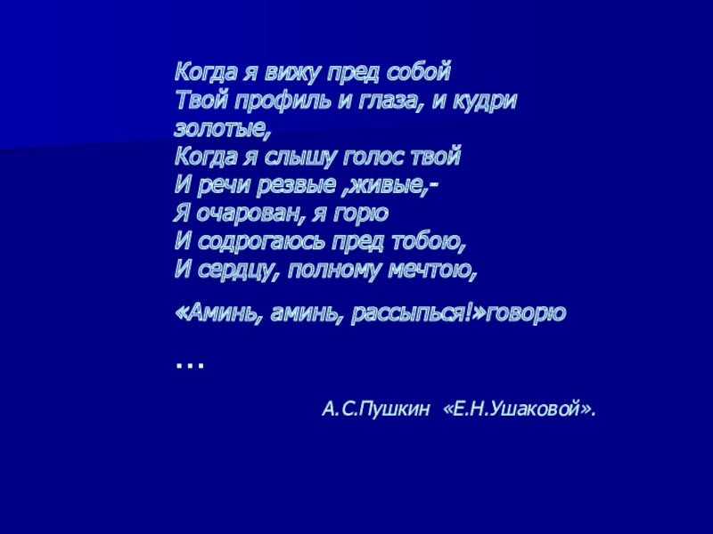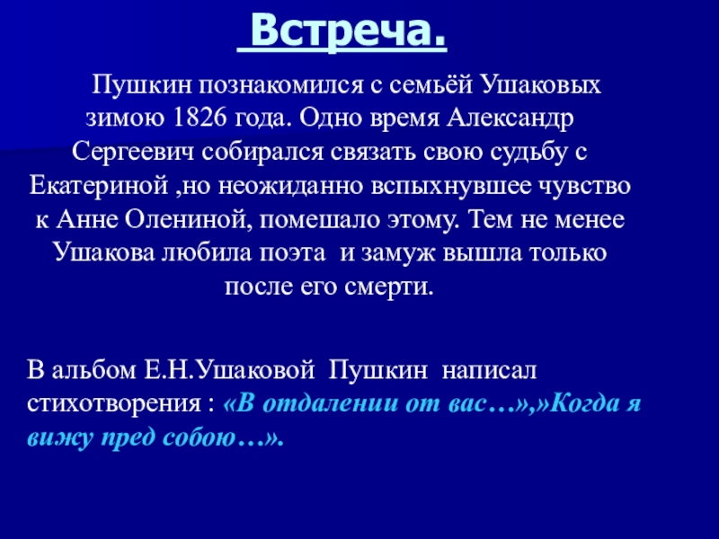 В альбом Е.Н.Ушаковой Пушкин написал стихотворения : «В отдалении от вас…»,»Когда я вижу пред собою…».