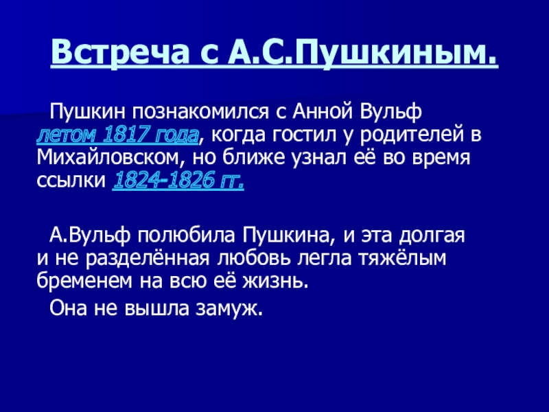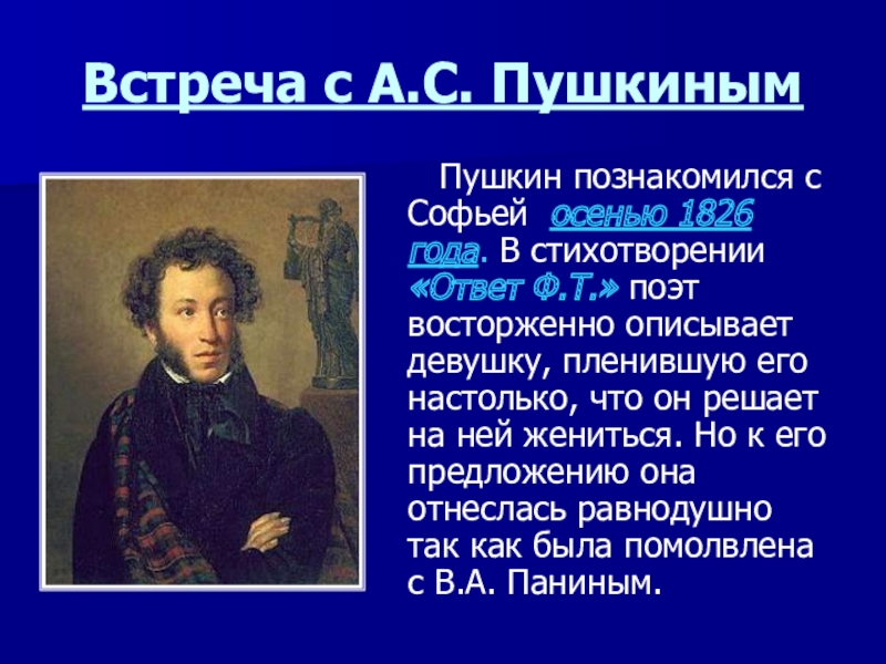 В 1828 году А.С.Пушкин сделал Анне предложение, но родители решили ему отказать, да и сама она была к нему равнодушной.