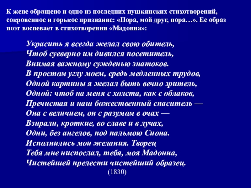 К жене обращено и одно из последних пушкинских стихотворений, сокровенное и горькое признание: «Пора, мой друг, пора…». Ее образ поэт воспевает в стихотворении «Мадонна»: