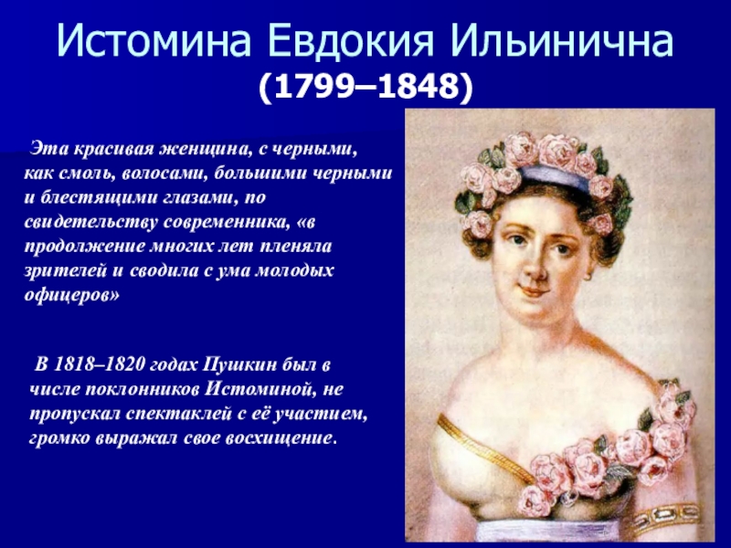 В 1818–1820 годах Пушкин был в числе поклонников Истоминой, не пропускал спектаклей с её участием, громко выражал свое восхищение.