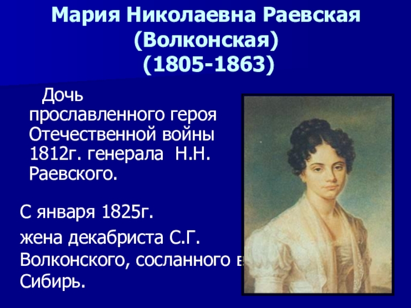 жена декабриста С.Г.Волконского, сосланного в Сибирь.
