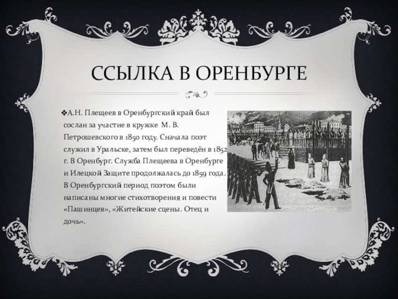 в кружке М. В. Петрошевского в 1850 году. Сначала поэт служил в Уральске, затем был переведён в 1852 г. В Оренбург. Служба Плещеева в Оренбурге и Илецкой Защите продолжалась до 1859 года. В Оренбургский период поэтом были написаны многие стихотворения и повести «Пашинцев», «Житейские сцены. Отец и дочь».