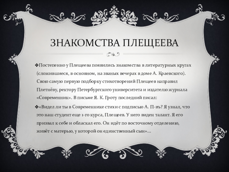 основном, на званых вечерах в доме А. Краевского). Свою самую первую подборку стихотворений Плещеев направил Плетнёву, ректору Петербургского университета и издателю журнала «Современник». В письме Я. К. Гроту последний писал: