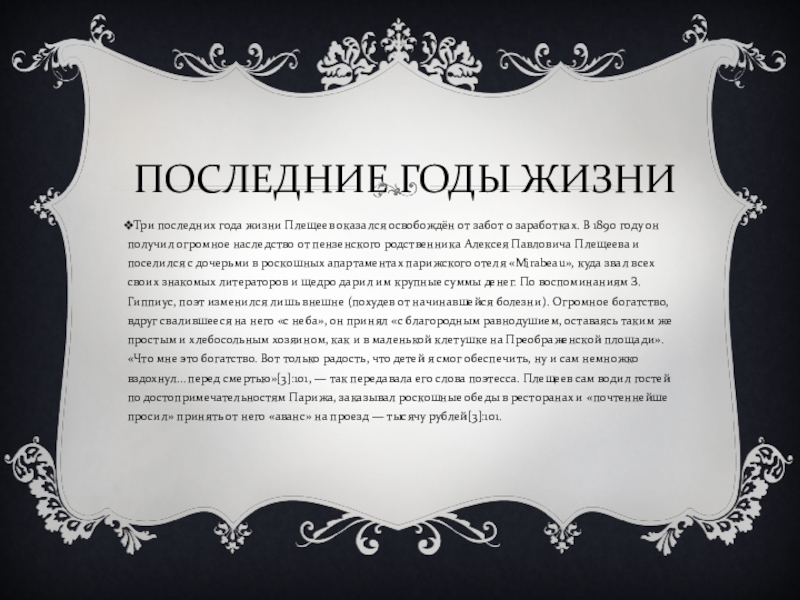 о заработках. В 1890 году он получил огромное наследство от пензенского родственника Алексея Павловича Плещеева и поселился с дочерьми в роскошных апартаментах парижского отеля «Mirabeau», куда звал всех своих знакомых литераторов и щедро дарил им крупные суммы денег. По воспоминаниям З. Гиппиус, поэт изменился лишь внешне (похудев от начинавшейся болезни). Огромное богатство, вдруг свалившееся на него «с неба», он принял «с благородным равнодушием, оставаясь таким же простым и хлебосольным хозяином, как и в маленькой клетушке на Преображенской площади». «Что мне это богатство. Вот только радость, что детей я смог обеспечить, ну и сам немножко вздохнул… перед смертью»[3]:101, — так передавала его слова поэтесса. Плещеев сам водил гостей по достопримечательностям Парижа, заказывал роскошные обеды в ресторанах и «почтеннейше просил» принять от него «аванс» на проезд — тысячу рублей[3]:101.