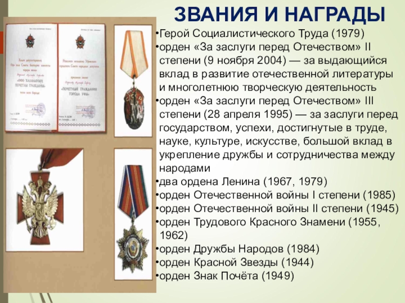орден «За заслуги перед Отечеством» II степени (9 ноября 2004) — за выдающийся вклад в развитие отечественной литературы и многолетнюю творческую деятельность