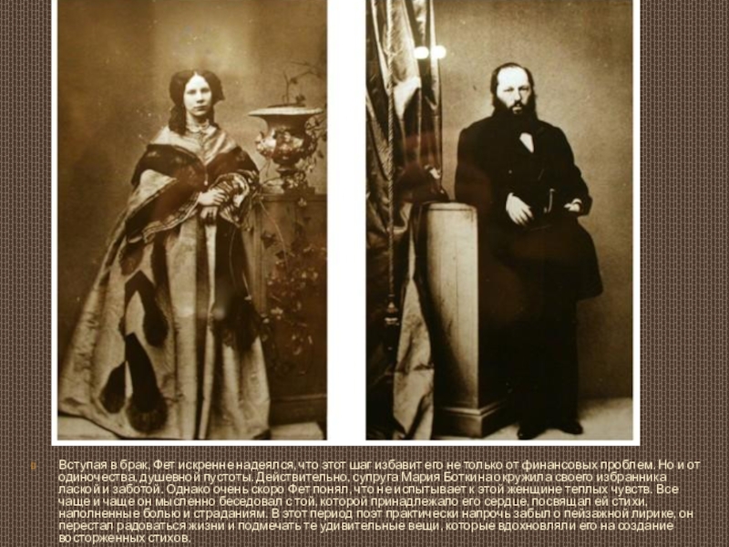 не только от финансовых проблем. Но и от одиночества, душевной пустоты. Действительно, супруга Мария Боткина окружила своего избранника лаской и заботой. Однако очень скоро Фет понял, что не испытывает к этой женщине теплых чувств. Все чаще и чаще он мысленно беседовал с той, которой принадлежало его сердце, посвящал ей стихи, наполненные болью и страданиям. В этот период поэт практически напрочь забыл о пейзажной лирике, он перестал радоваться жизни и подмечать те удивительные вещи, которые вдохновляли его на создание восторженных стихов.