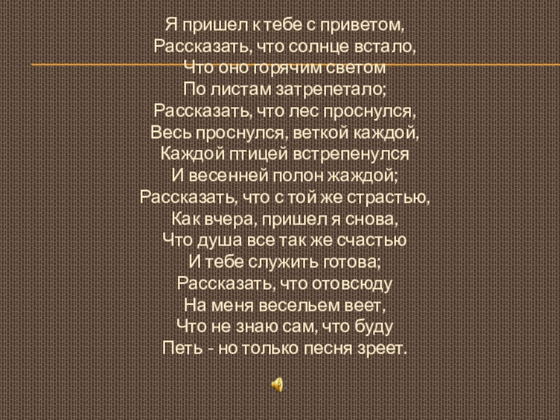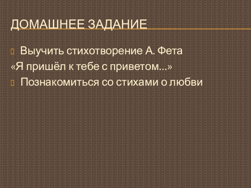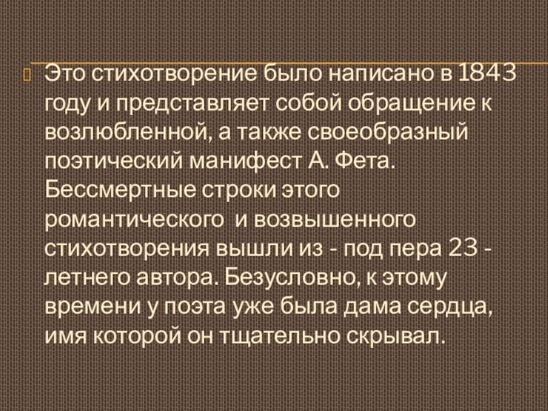 к возлюбленной, а также своеобразный поэтический манифест А. Фета. Бессмертные строки этого романтического и возвышенного стихотворения вышли из - под пера 23 - летнего автора. Безусловно, к этому времени у поэта уже была дама сердца, имя которой он тщательно скрывал.