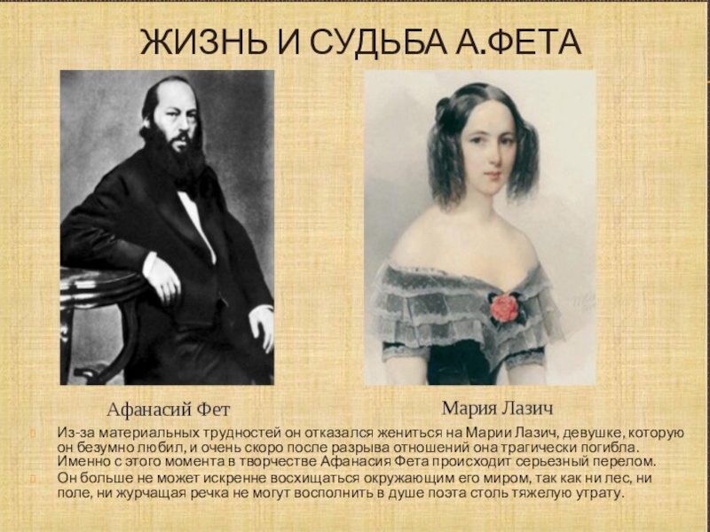 Лазич, девушке, которую он безумно любил, и очень скоро после разрыва отношений она трагически погибла. Именно с этого момента в творчестве Афанасия Фета происходит серьезный перелом.
