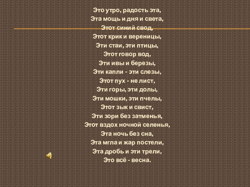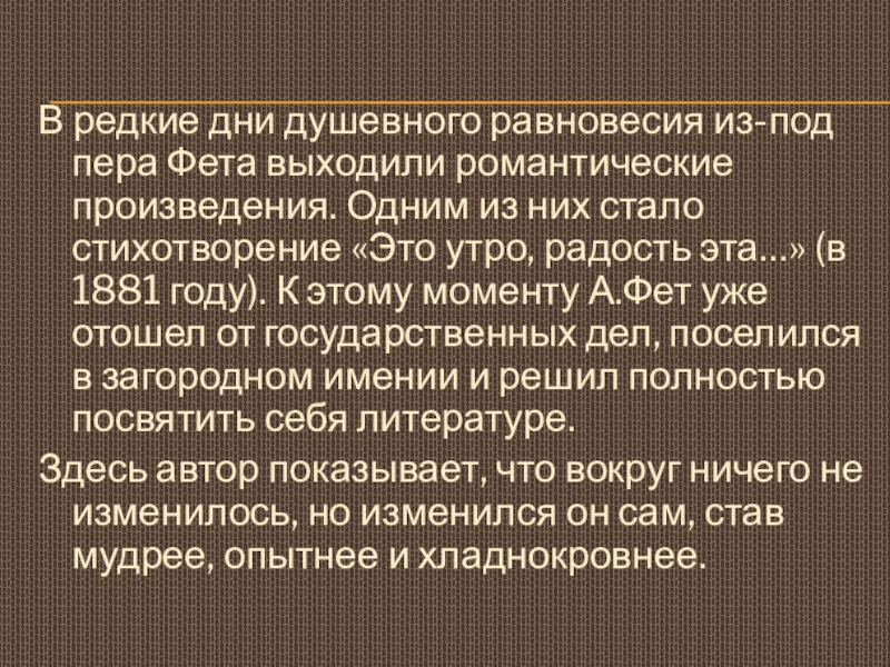 Одним из них стало стихотворение «Это утро, радость эта…» (в 1881 году). К этому моменту А.Фет уже отошел от государственных дел, поселился в загородном имении и решил полностью посвятить себя литературе.