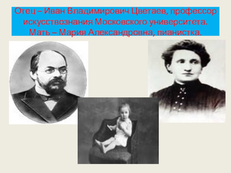 Слайд 3Отец – Иван Владимирович Цветаев, профессор искусствознания Московского университета. Мать – Мария