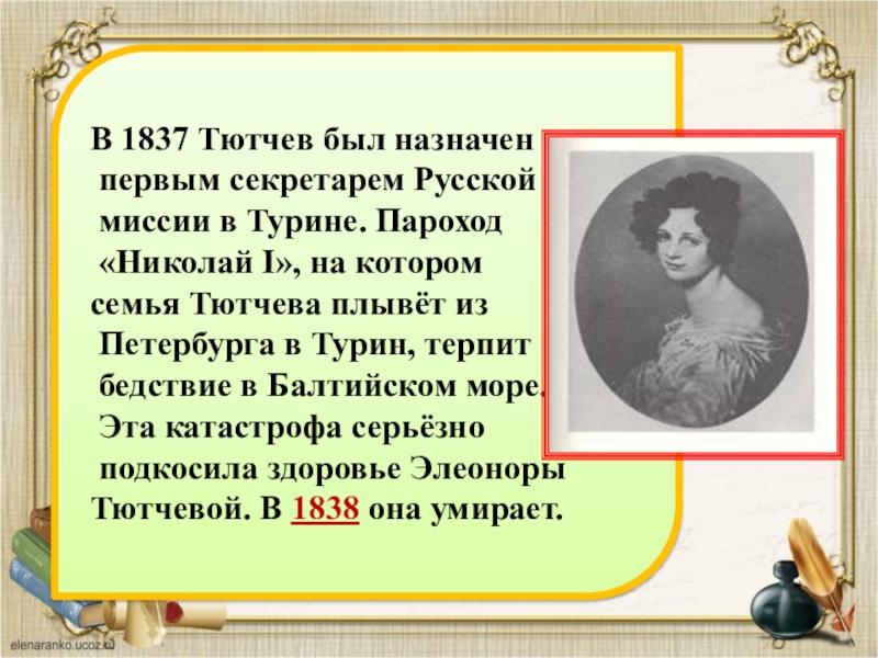 подкосила здоровье Элеоноры Тютчевой. В 1838 она умирает.