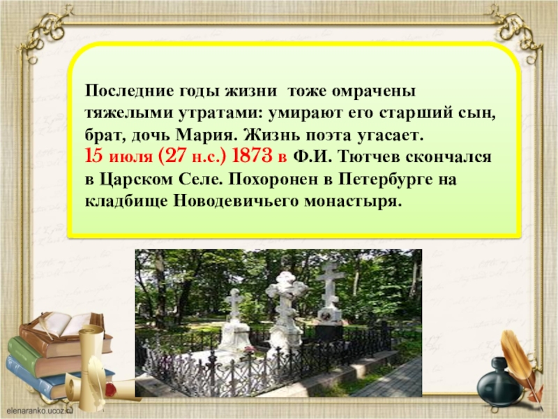 15 июля (27 н.с.) 1873 в Ф.И. Тютчев скончался в Царском Селе. Похоронен в Петербурге на кладбище Новодевичьего монастыря.