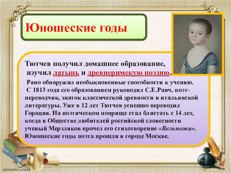 С 1813 года его образованием руководил С.Е.Раич, поэт- переводчик, знаток классической древности и итальянской литературы. Уже в 12 лет Тютчев успешно переводил Горация. На поэтическом поприще стал блистать с 14 лет, когда в Обществе любителей российской словесности ученый Мерзляков прочел его стихотворение «Вельможа».