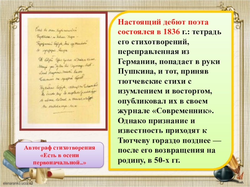 из Германии, попадает в руки Пушкина, и тот, приняв тютчевские стихи с изумлением и восторгом, опубликовал их в своем журнале «Современник». Однако признание и известность приходят к Тютчеву гораздо позднее — после его возвращения на родину, в 50-х гг.