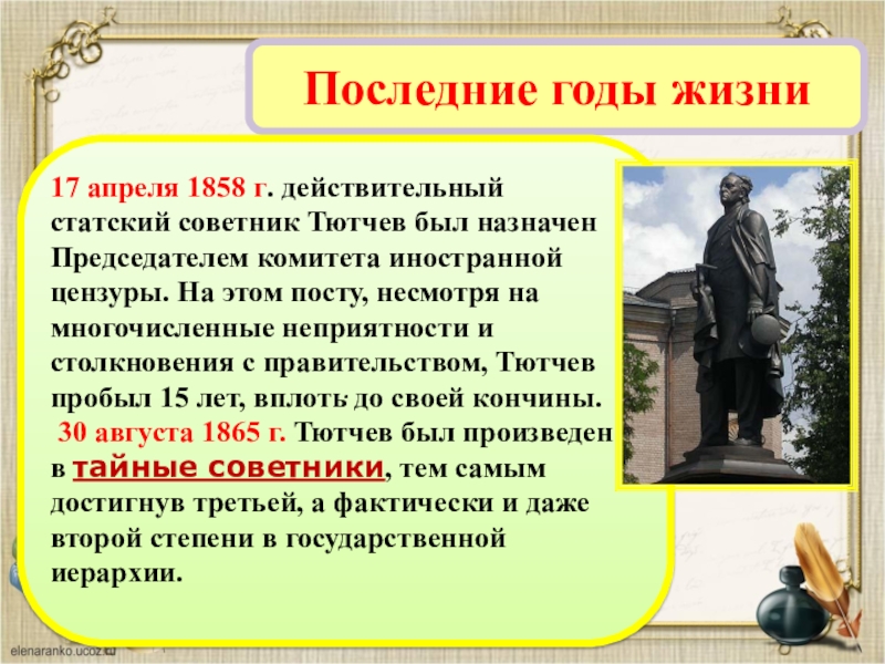 назначен Председателем комитета иностранной цензуры. На этом посту, несмотря на многочисленные неприятности и столкновения с правительством, Тютчев пробыл 15 лет, вплоть до своей кончины.