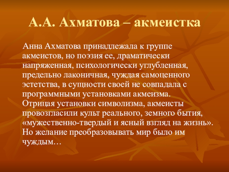 А.А. Ахматова – акмеистка  Анна Ахматова принадлежала к группе акмеистов, но поэзия ее, драматически напряженная, психологически