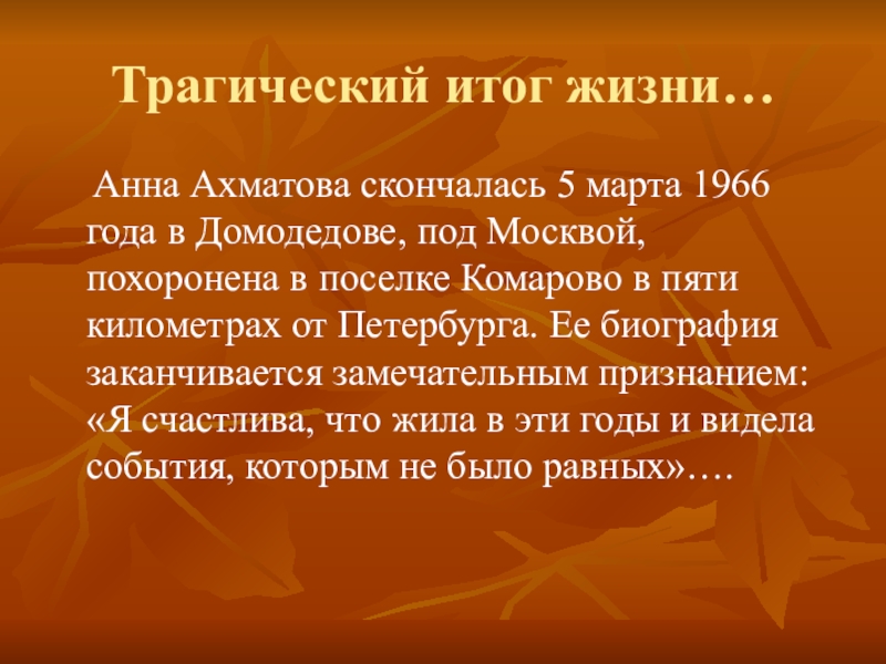 Трагический итог жизни…  Анна Ахматова скончалась 5 марта 1966 года в Домодедове, под Москвой, похоронена в