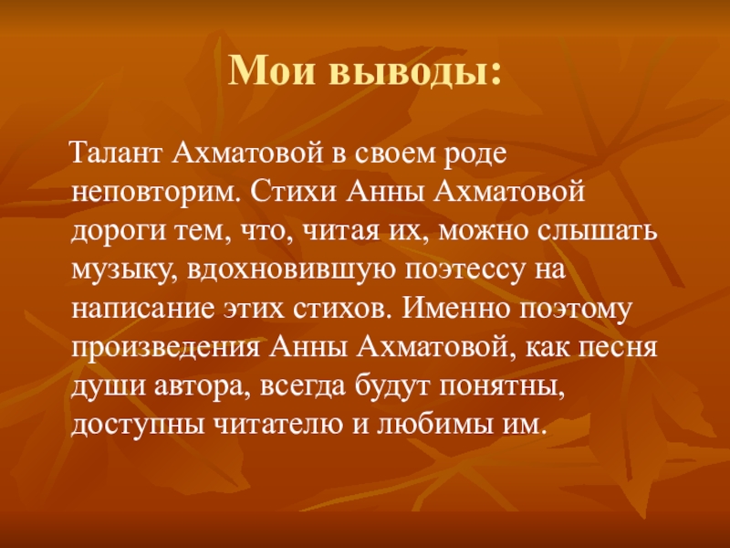 Мои выводы:  Талант Ахматовой в своем роде неповторим. Стихи Анны Ахматовой дороги тем, что, читая их,