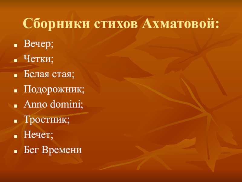 Сборники стихов Ахматовой:Вечер;Четки;Белая стая;Подорожник;Anno domini;Тростник;Нечет;Бег Времени