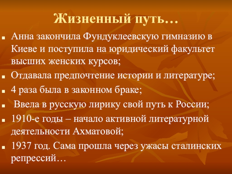 Жизненный путь…Анна закончила Фундуклеевскую гимназию в Киеве и поступила на юридический факультет высших женских курсов;Отдавала предпочтение истории