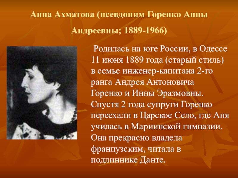 Анна Ахматова (псевдоним Горенко Анны Андреевны; 1889-1966) Родилась на юге России, в Одессе 11 июня 1889 года (старый стиль) в семье инженер-капитана 2-го ранга Андрея Антоновича Горенко и Инны Эразмовны. Спустя 2 года супруги