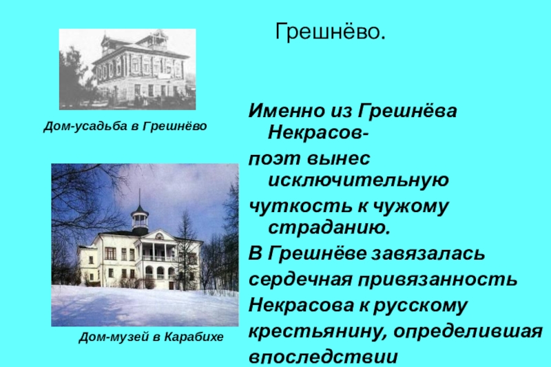 Николай Алексеевич Некрасов родился 28 ноября 1821г.в местечке Немирове Подольской губернии. Он был третьим ребенком в семье. Мать — Елена Андреевна, малороссийская дворянка. Отец — Алексей Сергеевич Некрасов, небогатый помещик, армейский офицер. Через три года после рождения сына он, выйдя в отставку майором, навсегда переселился в свое родовое поместье в Ярославском имении Грешневе, которое находилось недалеко от Волги.