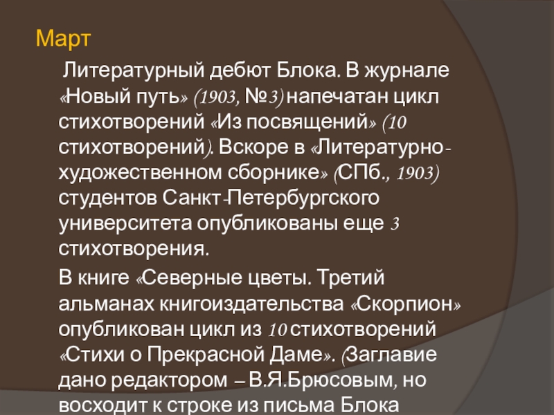 В книге «Северные цветы. Третий альманах книгоиздательства «Скорпион» опубликован цикл из 10 стихотворений «Стихи о Прекрасной Даме». (Заглавие дано редактором – В.Я.Брюсовым, но восходит к строке из письма Блока Брюсову от 1 февраля 1903 года.)
