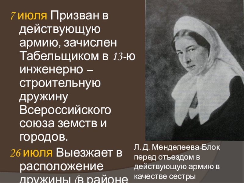 Л. Д. Менделеева-Блок перед отъездом в действующую армию в качестве сестры милосердия.