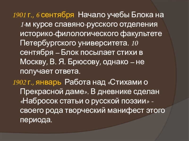 отделения историко-филологического факультете Петербургского университета. 10 сентября – Блок посылает стихи в Москву, В. Я. Брюсову, однако – не получает ответа.