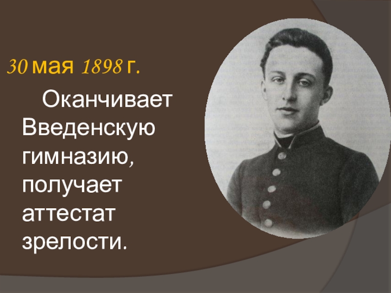 Слайд 91891г., 27 августа Принят в 1-й класс Санкт-Петербургской Введенской (позднее –