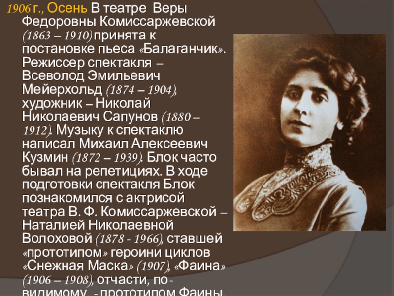 принята к постановке пьеса «Балаганчик». Режиссер спектакля – Всеволод Эмильевич Мейерхольд (1874 – 1904), художник – Николай Николаевич Сапунов (1880 – 1912). Музыку к спектаклю написал Михаил Алексеевич Кузмин (1872 – 1939). Блок часто бывал на репетициях. В ходе подготовки спектакля Блок познакомился с актрисой театра В. Ф. Комиссаржевской – Наталией Николаевной Волоховой (1878 - 1966), ставшей «прототипом» героини циклов «Снежная Маска» (1907), «Фаина» (1906 – 1908), отчасти, по-видимому, - прототипом Фаины, героини пьесы «Песня Судьбы» (1907 – 1908).