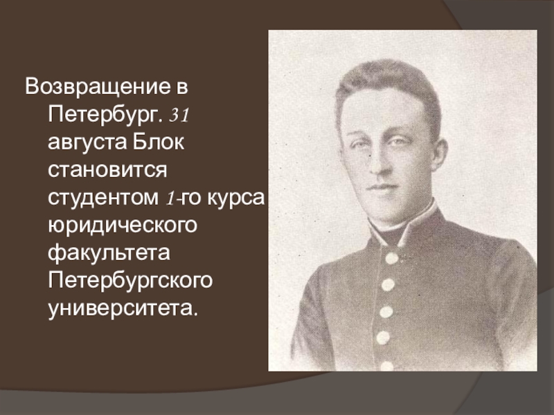 Слайд 19Возвращение в Петербург. 31 августа Блок становится студентом 1-го курса юридического