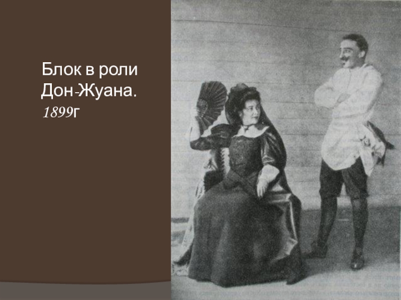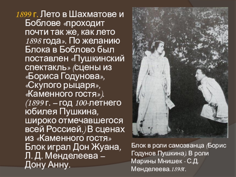 как лето 1898 года». По желанию Блока в Боблово был поставлен «Пушкинский спектакль» (сцены из «Бориса Годунова», «Скупого рыцаря», «Каменного гостя»). (1899 г. – год 100-летнего юбилея Пушкина, широко отмечавшегося всей Россией.) В сценах из «Каменного гостя» Блок играл Дон Жуана, Л. Д. Менделеева – Дону Анну.