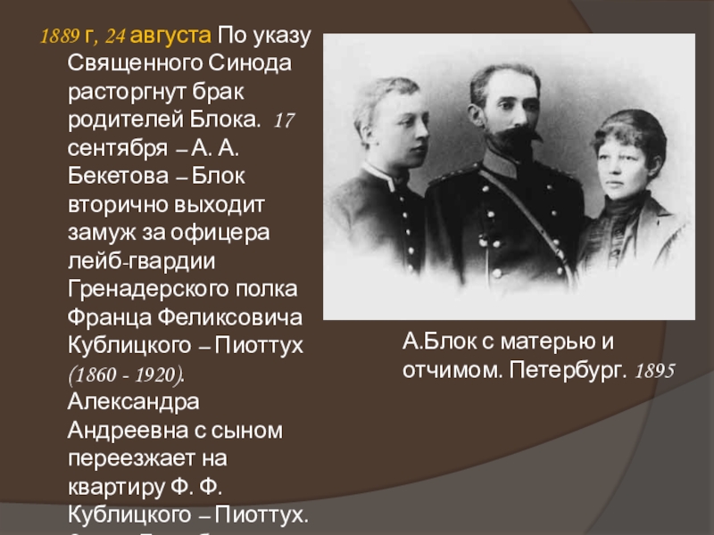 Блока. 17 сентября – А. А. Бекетова – Блок вторично выходит замуж за офицера лейб-гвардии Гренадерского полка Франца Феликсовича Кублицкого – Пиоттух (1860 - 1920). Александра Андреевна с сыном переезжает на квартиру Ф. Ф. Кублицкого – Пиоттух. Здесь Блок будет жить до осени 1906 г.