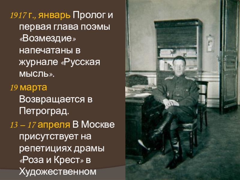 Слайд 491917 г., январь Пролог и первая глава поэмы «Возмездие» напечатаны в