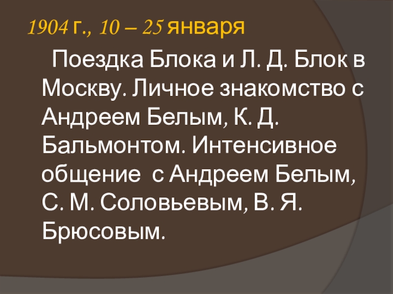 Л. Д. Блок в Москву. Личное знакомство с Андреем Белым, К. Д. Бальмонтом. Интенсивное общение с Андреем Белым, С. М. Соловьевым, В. Я. Брюсовым.