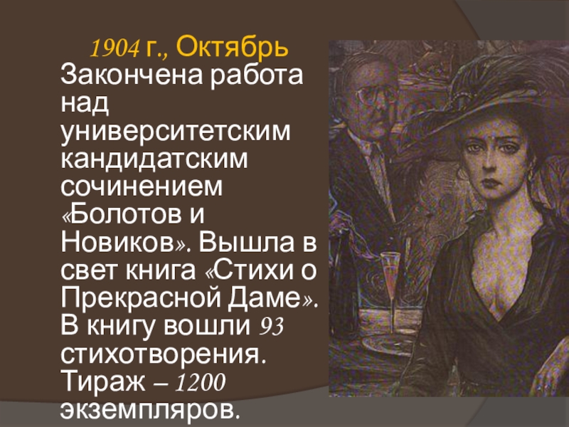кандидатским сочинением «Болотов и Новиков». Вышла в свет книга «Стихи о Прекрасной Даме». В книгу вошли 93 стихотворения. Тираж – 1200 экземпляров.