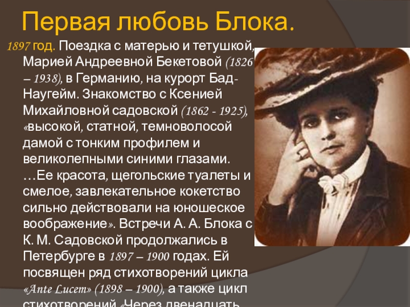 Бекетовой (1826 – 1938), в Германию, на курорт Бад-Наугейм. Знакомство с Ксенией Михайловной садовской (1862 - 1925), «высокой, статной, темноволосой дамой с тонким профилем и великолепными синими глазами. …Ее красота, щегольские туалеты и смелое, завлекательное кокетство сильно действовали на юношеское воображение». Встречи А. А. Блока с К. М. Садовской продолжались в Петербурге в 1897 – 1900 годах. Ей посвящен ряд стихотворений цикла «Ante Lucem» (1898 – 1900), а также цикл стихотворений «Через двенадцать лет» (1909 - 1910).