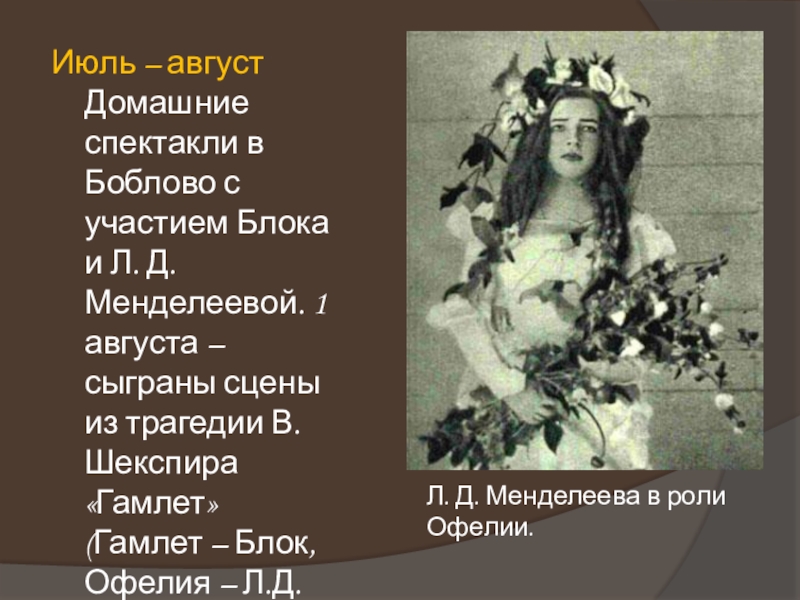 Л. Д. Менделеевой. 1 августа – сыграны сцены из трагедии В. Шекспира «Гамлет» (Гамлет – Блок, Офелия – Л.Д. Менделеева).