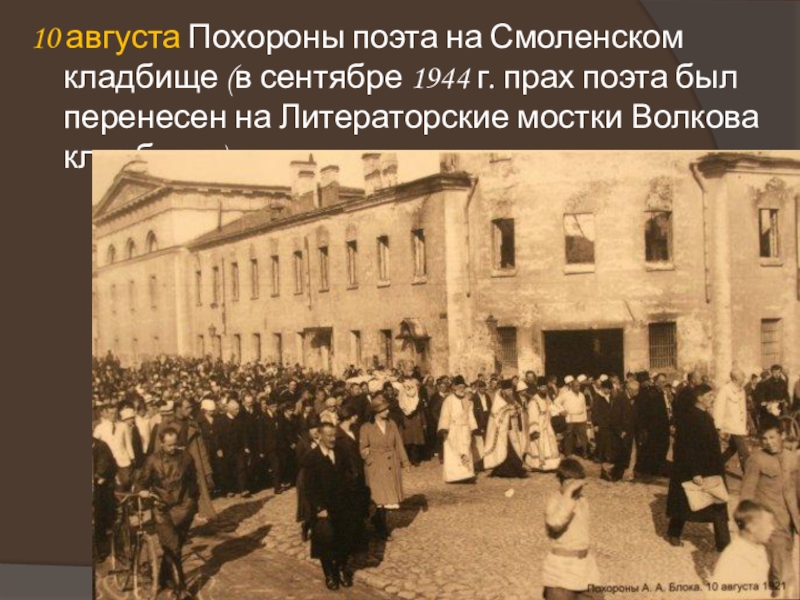 Слайд 5510 августа Похороны поэта на Смоленском кладбище (в сентябре 1944 г.