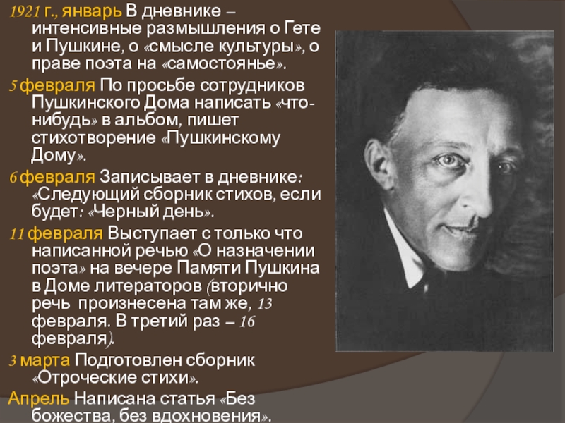 Слайд 531921 г., январь В дневнике – интенсивные размышления о Гете и