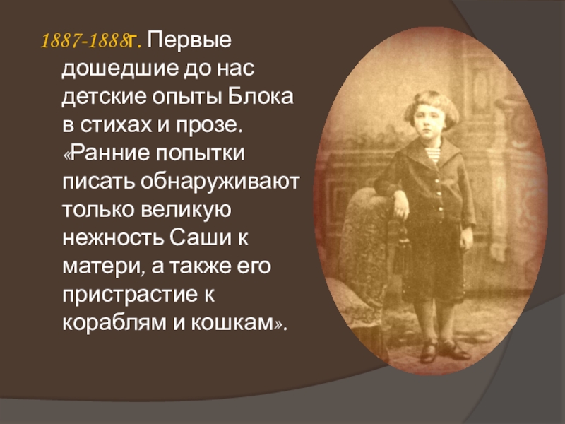прозе. «Ранние попытки писать обнаруживают только великую нежность Саши к матери, а также его пристрастие к кораблям и кошкам».