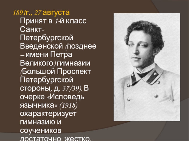 имени Петра Великого) гимназии (Большой Проспект Петербургской стороны, д. 37/39). В очерке «Исповедь язычника» (1918) охарактеризует гимназию и соучеников достаточно жестко.