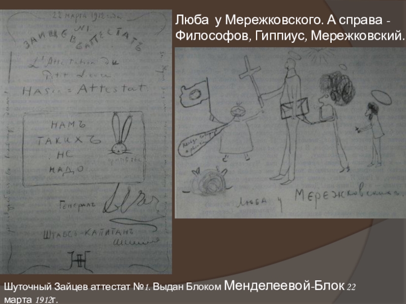 Слайд 38Шуточный Зайцев аттестат №1. Выдан Блоком Менделеевой-Блок 22 марта 1912г.