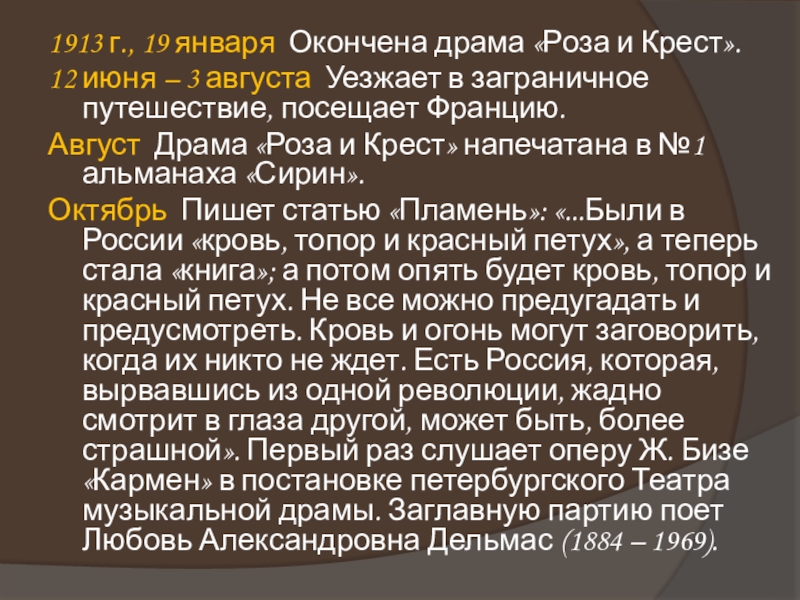 Октябрь Пишет статью «Пламень»: «...Были в России «кровь, топор и красный петух», а теперь стала «книга»; а потом опять будет кровь, топор и красный петух. Не все можно предугадать и предусмотреть. Кровь и огонь могут заговорить, когда их никто не ждет. Есть Россия, которая, вырвавшись из одной революции, жадно смотрит в глаза другой, может быть, более страшной». Первый раз слушает оперу Ж. Бизе «Кармен» в постановке петербургского Театра музыкальной драмы. Заглавную партию поет Любовь Александровна Дельмас (1884 – 1969).
